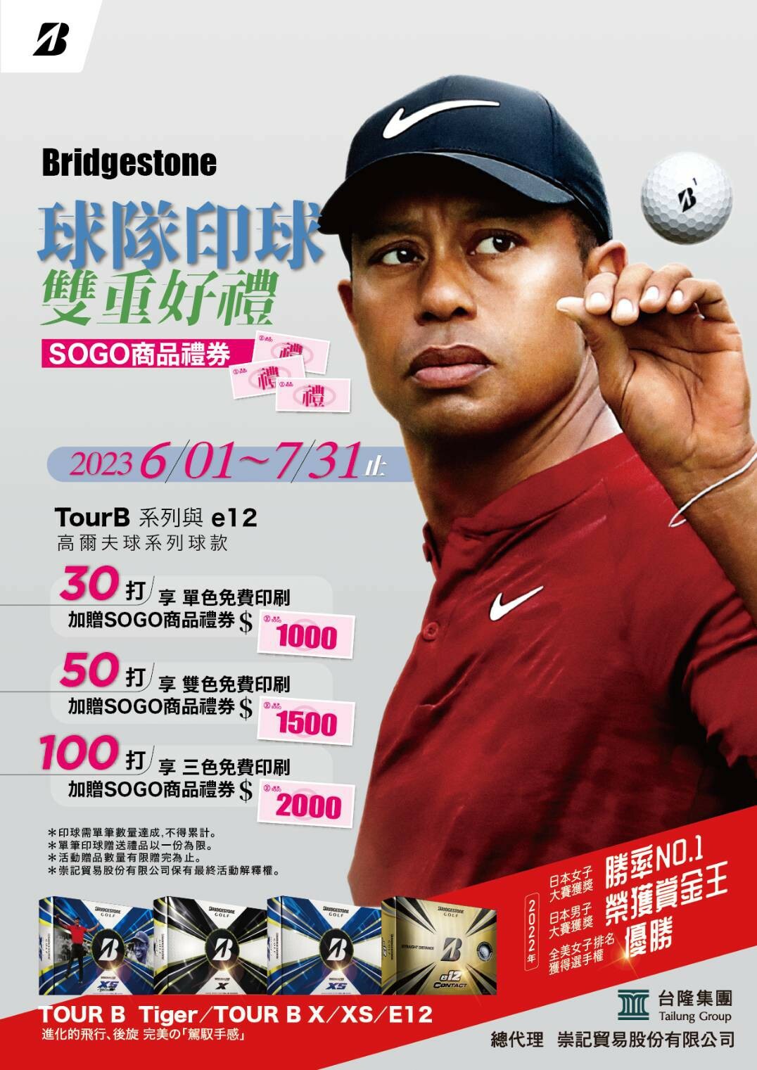 2023/06/01至 2023/07/31 購買 Bridgestone TourB 與 e12系列高爾夫球 指定球款單筆印球