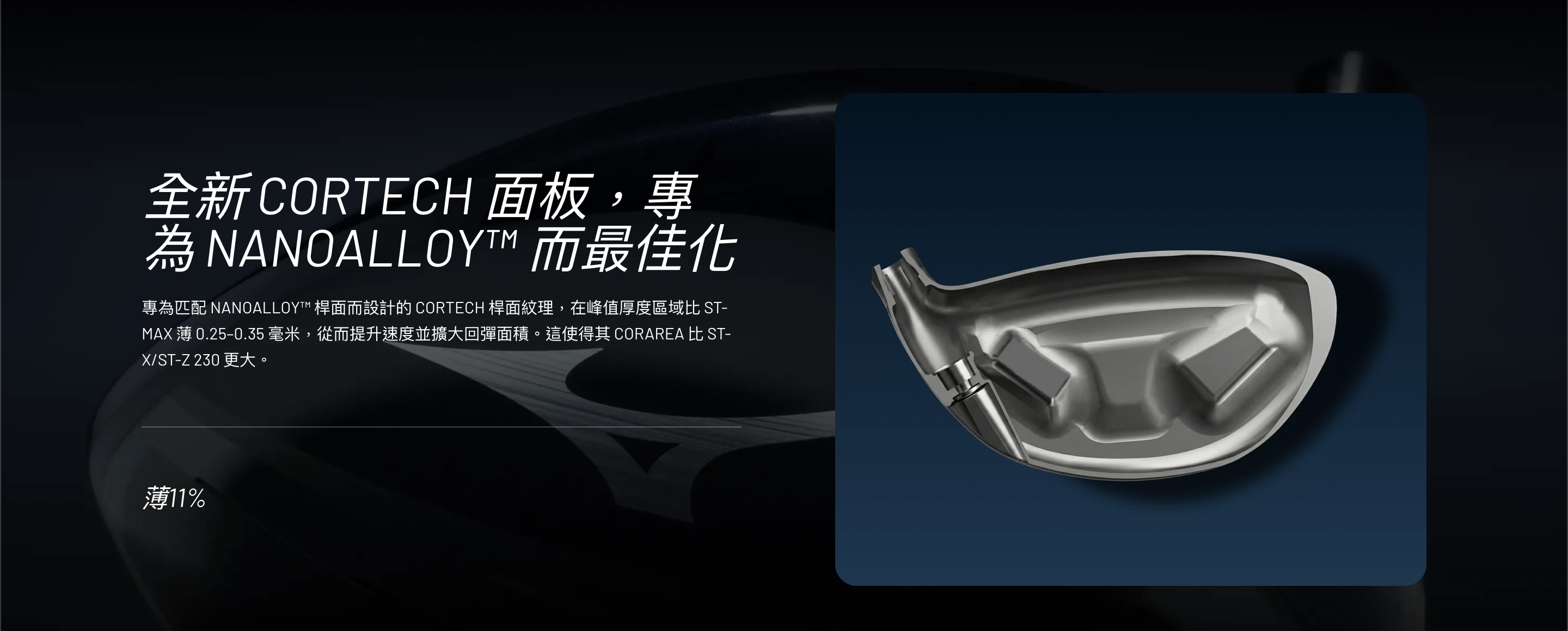 在鍛造鈦金屬桿面搭載僅 0.4mm 厚度的最新科技材質 NANOALLOY™ 奈米合金, 經數據測試驗證, 桿面的球速表現比鈦/尼龍/聚氨酯複合材料桿面還要更快!同時具備在擊球衝擊時“會變得柔軟”的特性, 產生出比一般鈦桿面更大幅度的形變, 能大幅降低擊球瞬間低能量損失, 同時實現 Mizuno Golf 史上最高的初速。