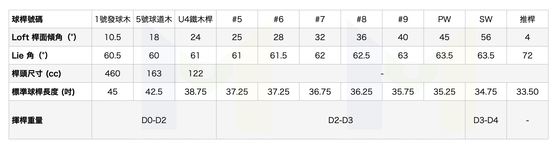 11支 = 1號發球木, 5號球道木(18度), U4小雞腿(24度), #5-9+P+S 7支鐵桿組, 推桿