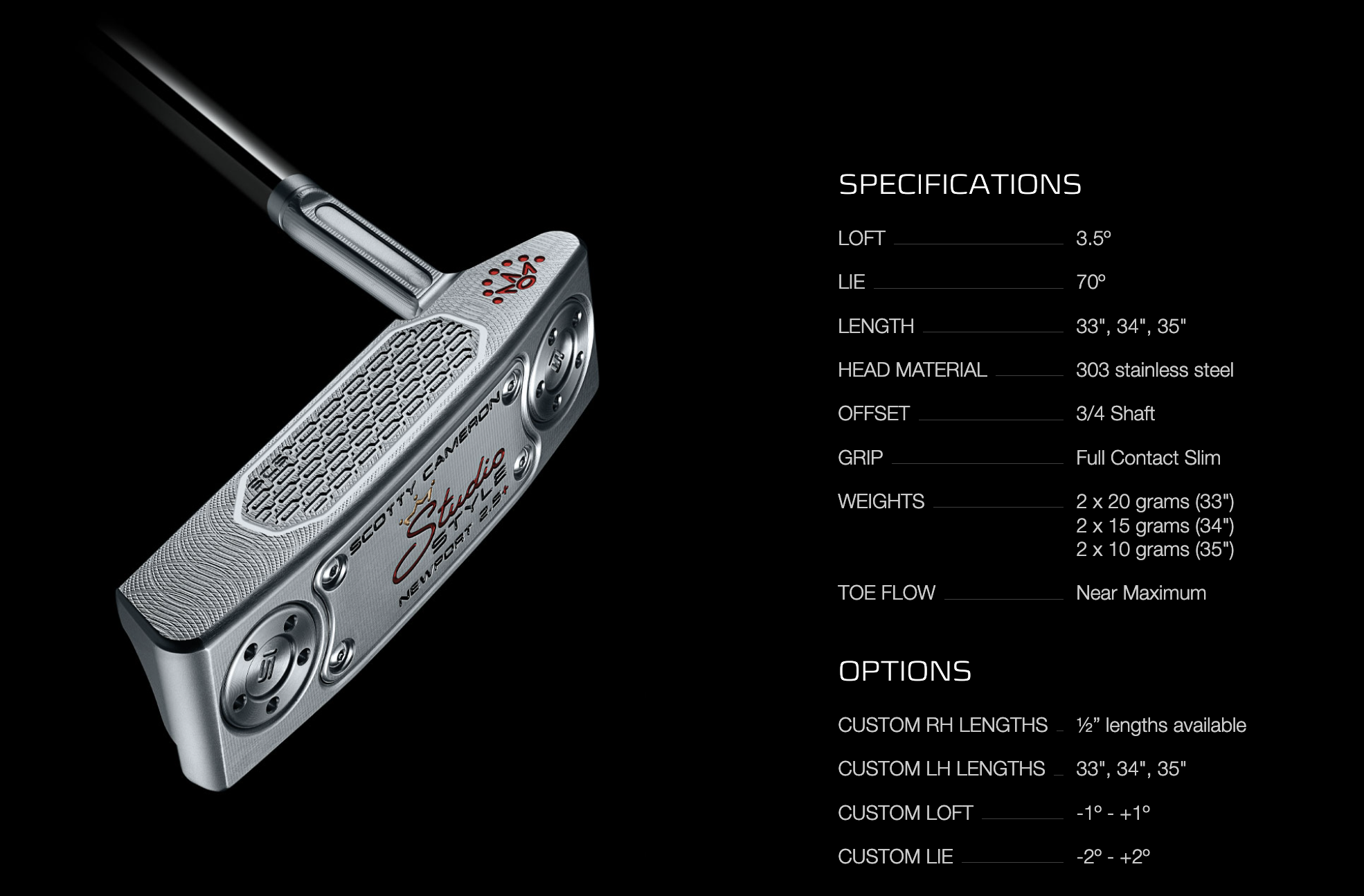 Newport 2.5 Plus 採用 303 不鏽鋼材質,在美國設計和精密銑削而成,配備鎢鋼桿底配重、其一體成型 6061 航空級鋁合金底板可將重量分配至推桿週邊,從而提高慣性矩 (MOI) 並增強平衡。 Newport 2.5 Plus 還帶有標誌性的紅色櫻桃點,並配備定制桿身環、桿頭套和定制設計的 Full Contact Slim 握把。