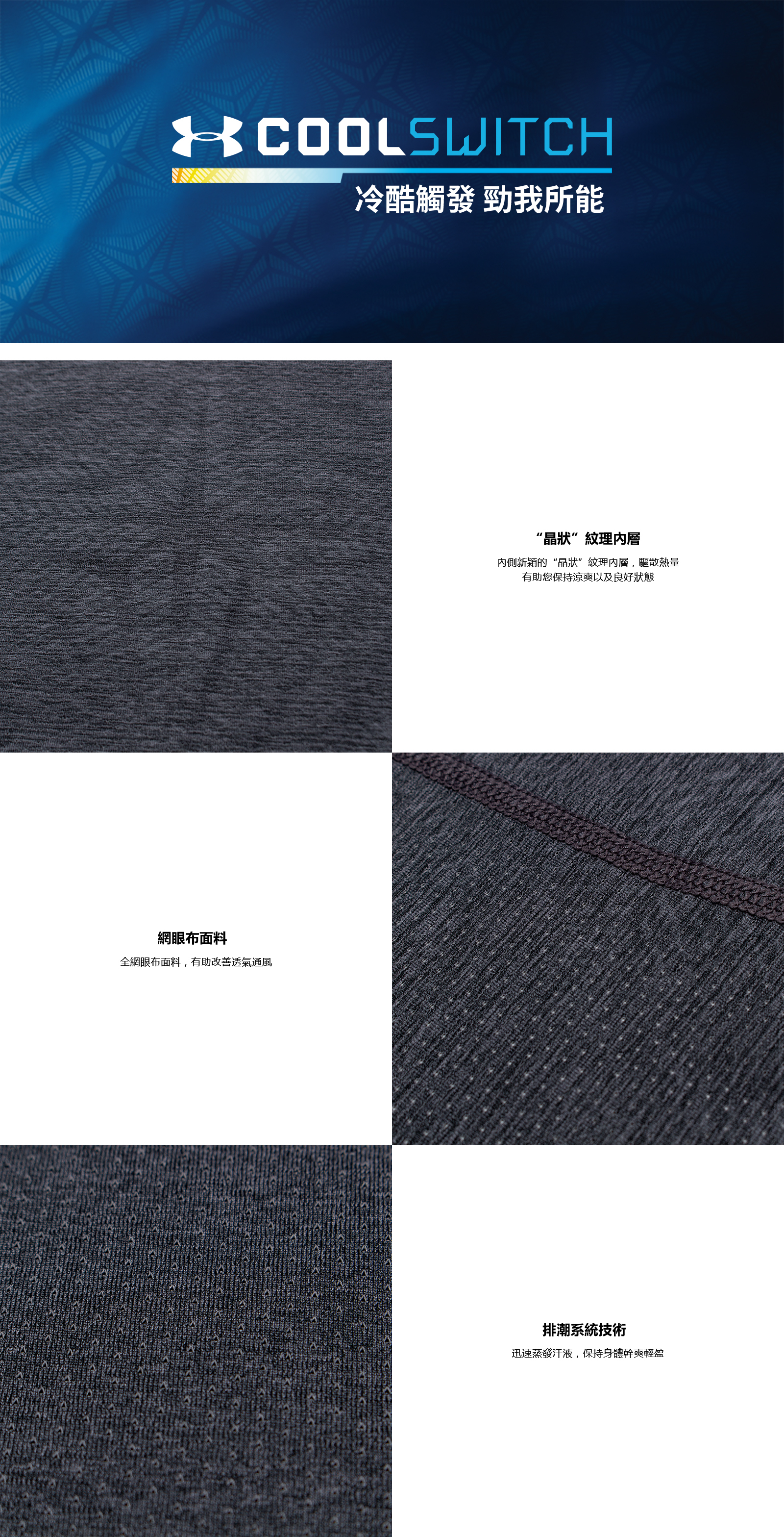 UA Coolswitch “晶狀”紋理專屬內層,驅散熱量,幫助你保持涼爽以及更為持久的良好狀態。